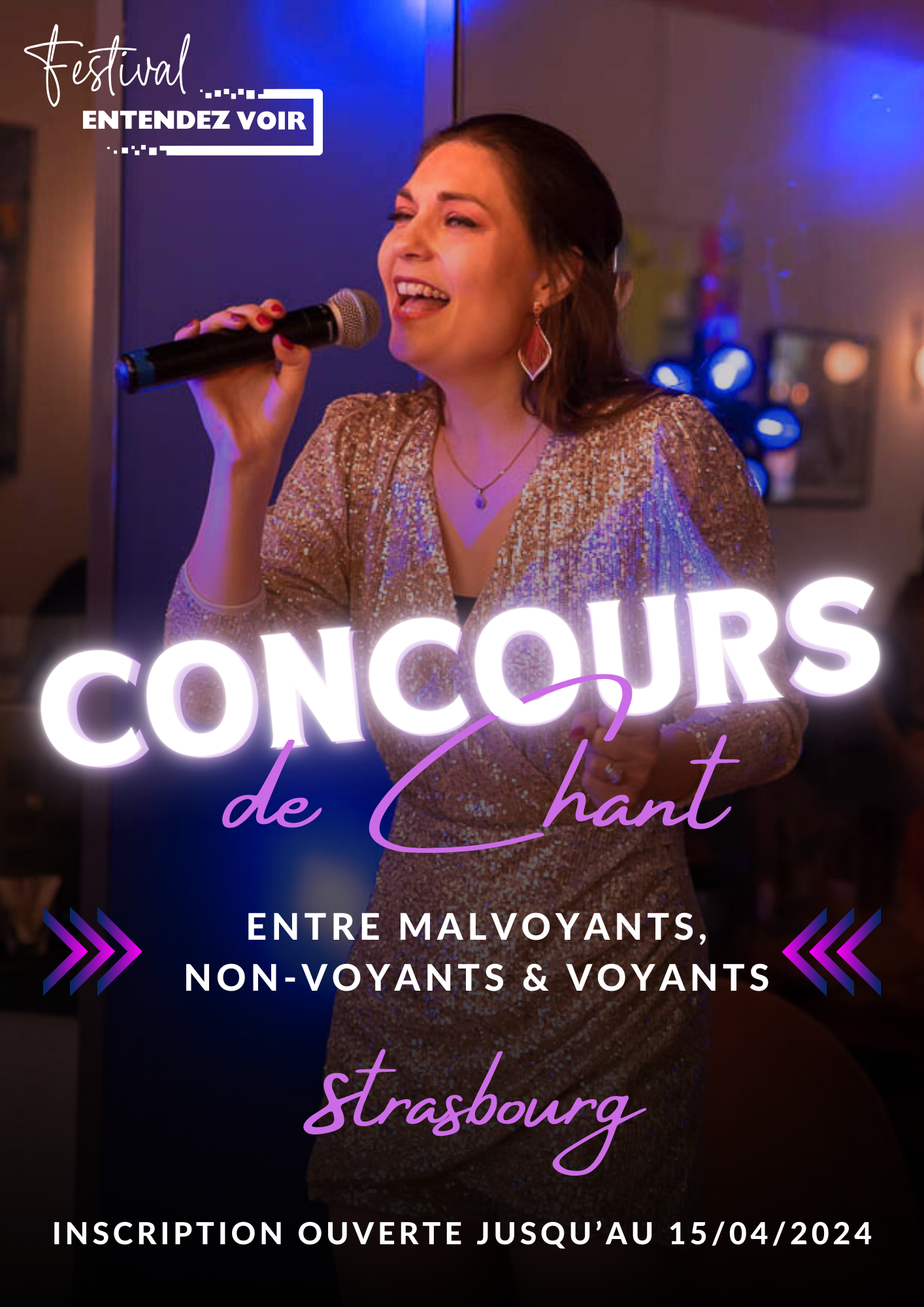 Le concours de chant est organisé par l’association Vue (d’) Ensemble dans le cadre du Festival Entendez-Voir ! Il est ouvert à tous : malvoyant, non-voyant et voyant à partir de 14 ans.De nombreux lots sont à gagner: Des chèques cadeaux, un séjour dans un hôtel avec des soins, du matériel de musique, des coffrets cadeaux, etc.